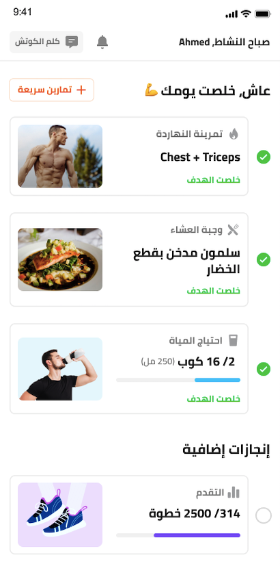 يناير 2019 كان أول ريلييز ل #الكوتش .. أبليكاشن أول ما تفتحه بتخش في conversation مع ال AI بتاعنا، تقوله انت عايز توصل لإيه، تفضيلاتك في التمارين والتغذية، بتدينا معلومات عن جسمك ولياقتك، وفي ثواني بيبقى برنامجك (تمارين + نظام غذائي) جاهز مناسب لأهدافك ومستواك وتفضيلاتك...