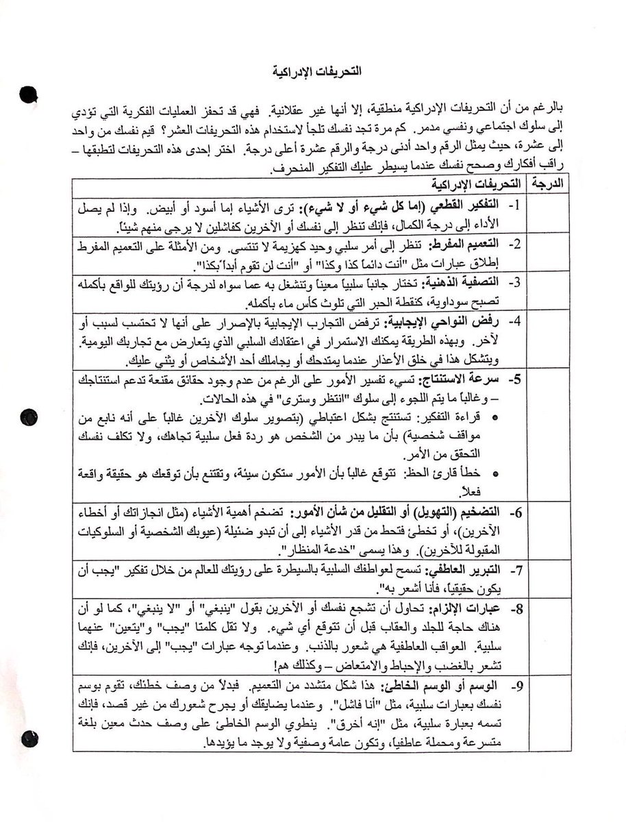 يمثل الأفكار الأقل خوفًا و10 يمثل الأفكار الأعلى خوفًا) بعد ذلك يُنصح بالتعرض للأفكار من الاقل للأعلى وبعد فترة سوف تجد أن شدة هذه الافكار تنخفض مع الوقت.