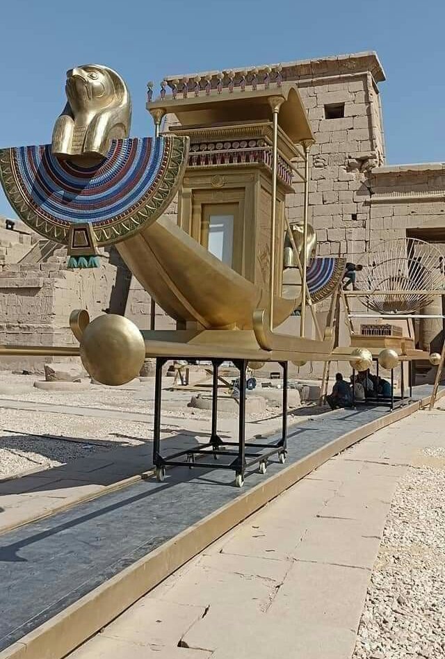 على أنغام أنشودة "آمون"وفي خطوات مهيبة ثابتة يتحرك موكب ضخم بالقارب المقدس من معبد الأقصر إلي معابد الكرنك على طول طريق الكباش بنحو 2700 متر لإفتتاح الطريق بعد الإنتهاء من ترميمه👇