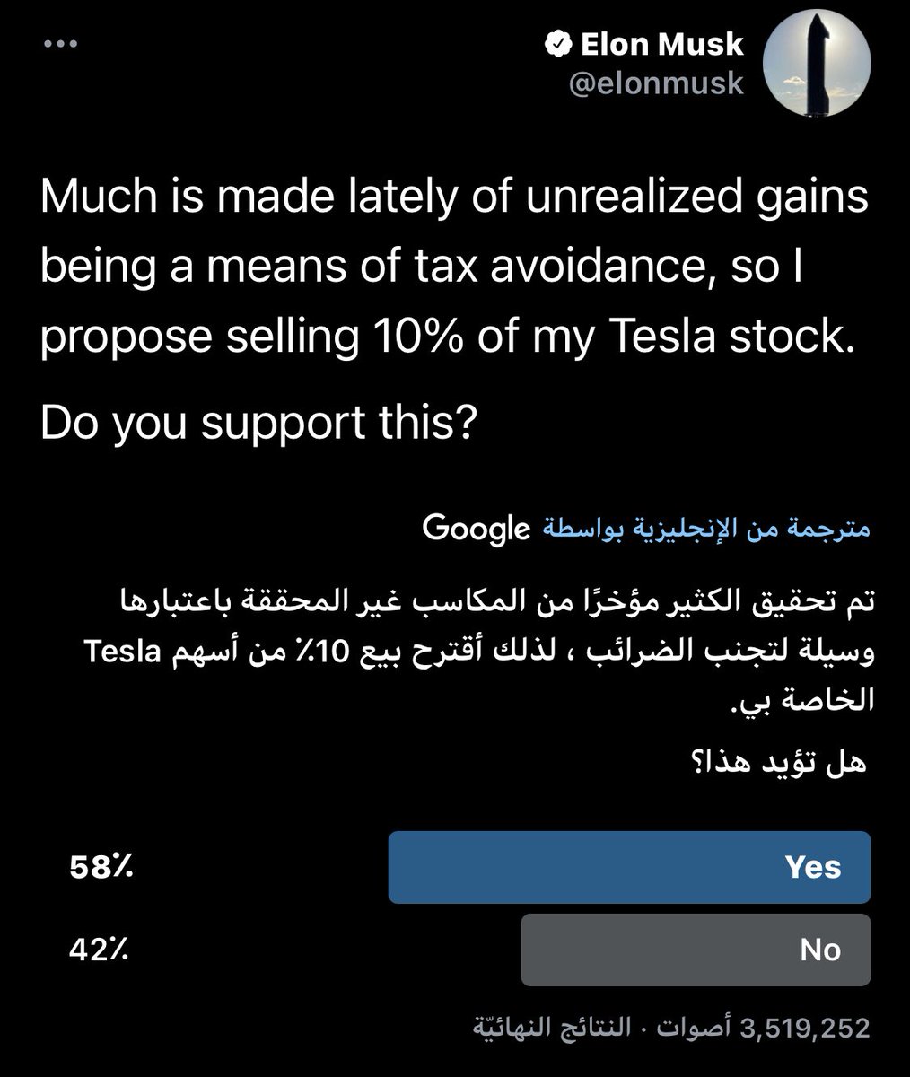 قبل ايام قام رجل الاعمال "إيلون ماسك" بالتويتر في استطلاع يقول فيه "هل يجب عليه بيع 10٪ من اسهم شركته تسلا"