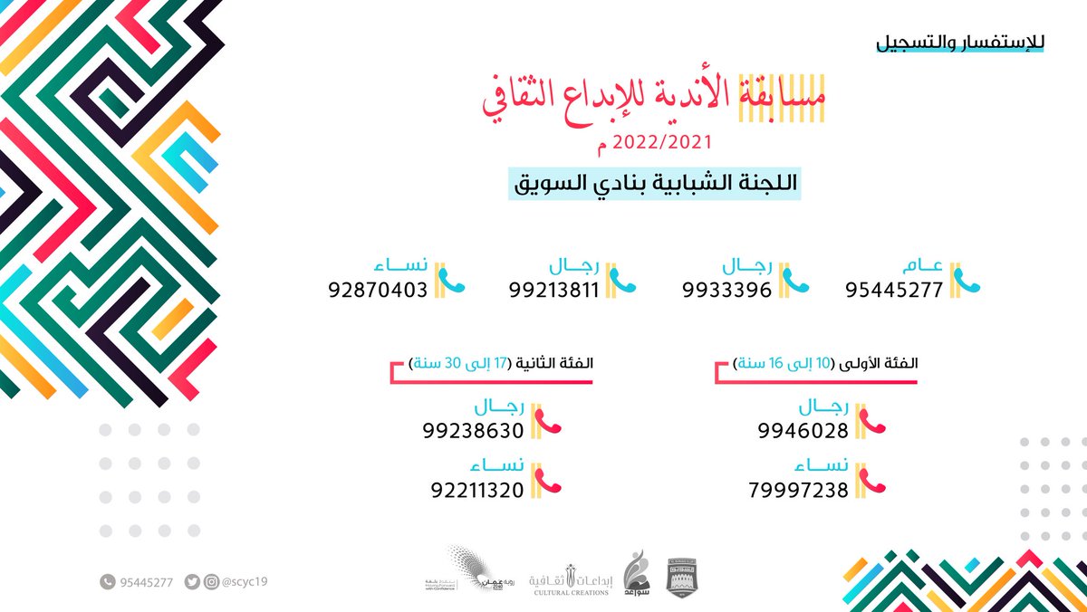 * للإستفسار و التسجيل في #مسابقة_الأندية_للإبداع_الثقافي 2021/2022م
