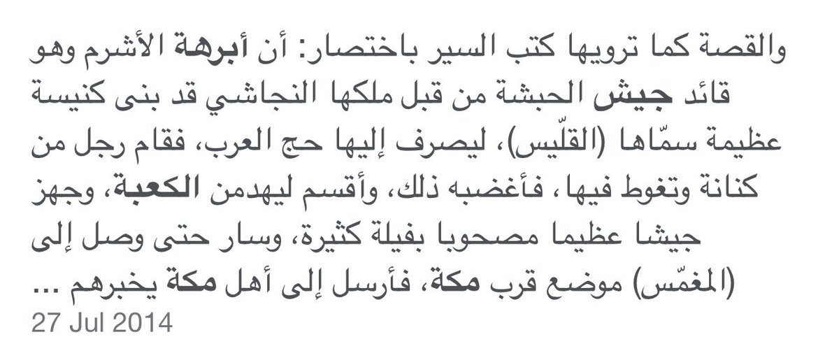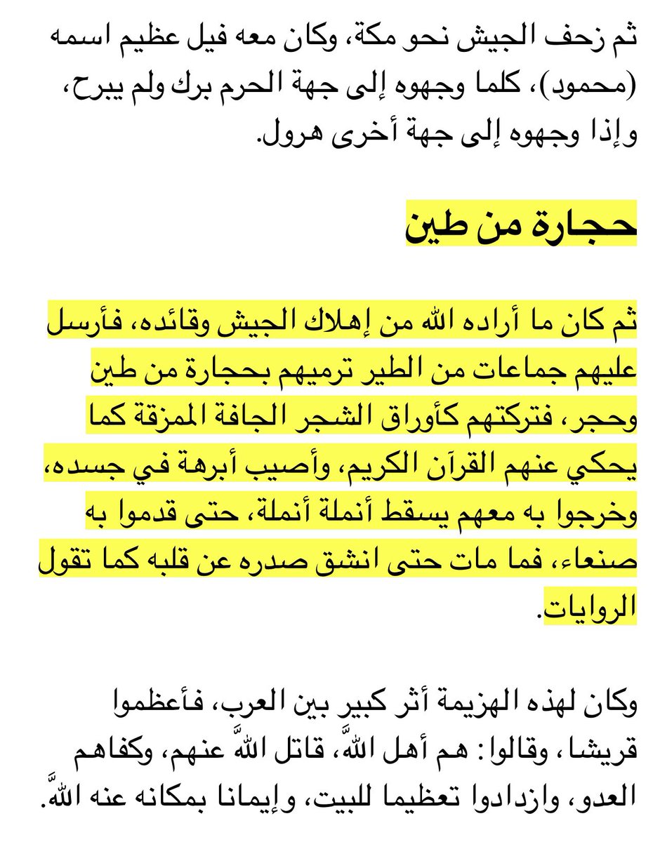 ﻭﻋﺎﺩ ﻫﺬﺍ ﺍﻻﺑﻦ ﻟﻴﺨﺒﺮ ﺃﺑﺎﻩ ﺃﻥ ﺳﺤﺎﺑﺔ ﺳﻮﺩﺍﺀ ﺗﺘﺠﻪ ﻣﻦ ﺍﻟﺒﺤﺮ ﺍﻻﺣﻤﺮ ﺍﻟﻰ ﺍﺭﺽ ﻣﻜﺔ ﻭﺍﻟﻔﻴﻞ ﺍﻟﺬﻱ ﻳﻤﺘﻄﻴﻪ (ﺃﺑﺮﻫﺔ) ﺭﻓﺾ ﺃﻥ ﻳﺘﺤﺮﻙ ﻭﻳﺘﻘﺪﻡ ﺍﻟﻰ ﺍﻻﻣﺎﻡ