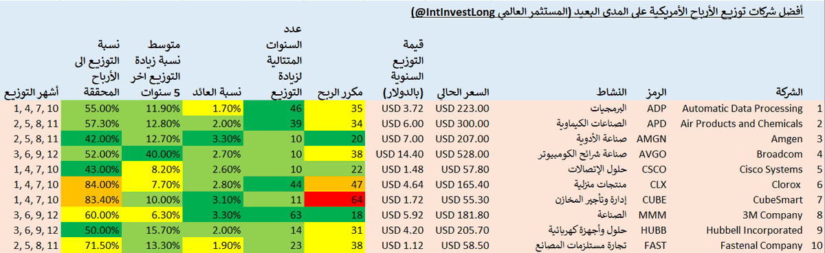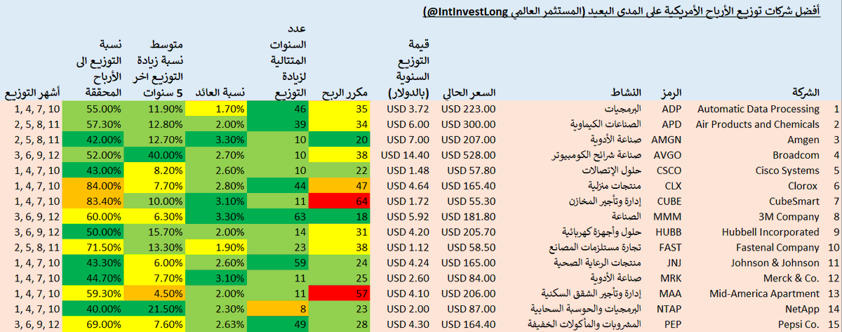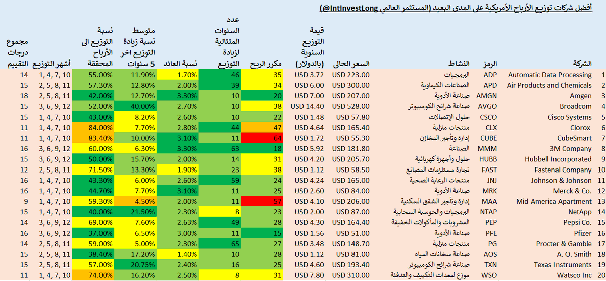 @WatscoInc هذه كانت الشركات الأمريكية العشرين الأفضل في رأيي من حيث نمو التوزيعات. هذه الشركات تصلح للاستثمار طويل المدى لمدة عشرين عاما أو أكثر، حيث أن العائد الحالي منها يعتبر ضعيف لكن مع الاستثمار المستمر فيها وإعادة استثمار التوزيعات في نفس الأسهم بتحصل نسبة عائد ممتاز عند التقاعد.