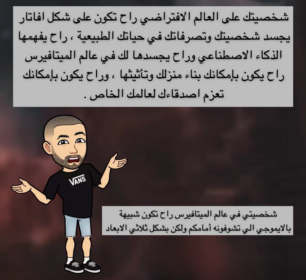 عصر #الميتافيرس راح يكون مختلف تماماً ، راح تكون جالس في بيتك لابس نظارة الواقع الافتراضي وتعيش جميع الامور الحياتية والاعتيادية عبر الواقع المعزز وراح تحضر المنتديات وتحضر المباريات وتدرس في الكلاسات وتعيش وكانك بينهم فعلياً .