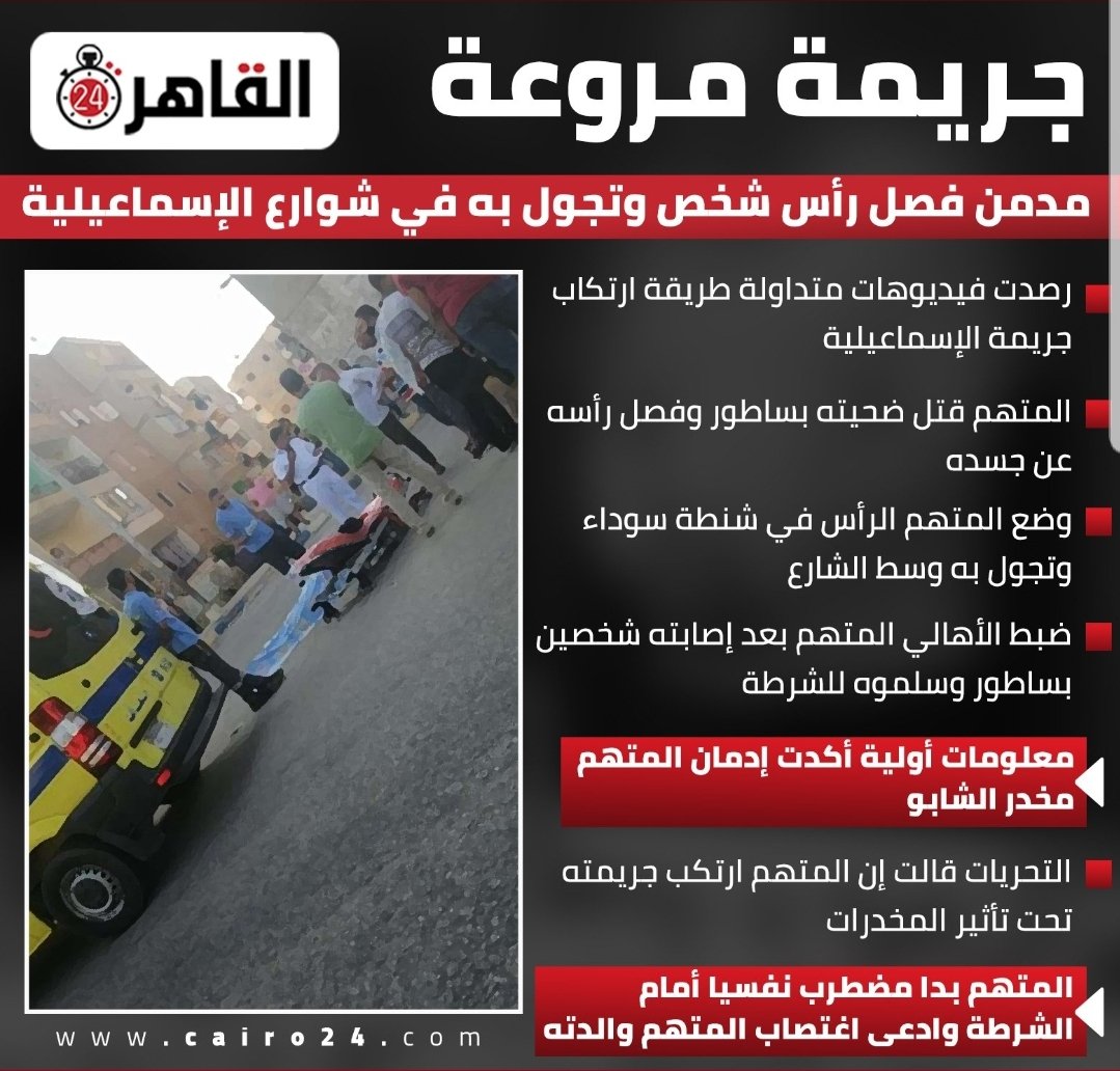 ويلبس مثل لبسه حسب مغردين شهود لجريمته ويقطع بالسكين رأس رجل آخر بالكامل في وسط الشارع ويتحول برأسه في الشوارع أمام الكاميرات في #الإسماعيلية في منتصف الشارع ويطلب تصويره علنا"