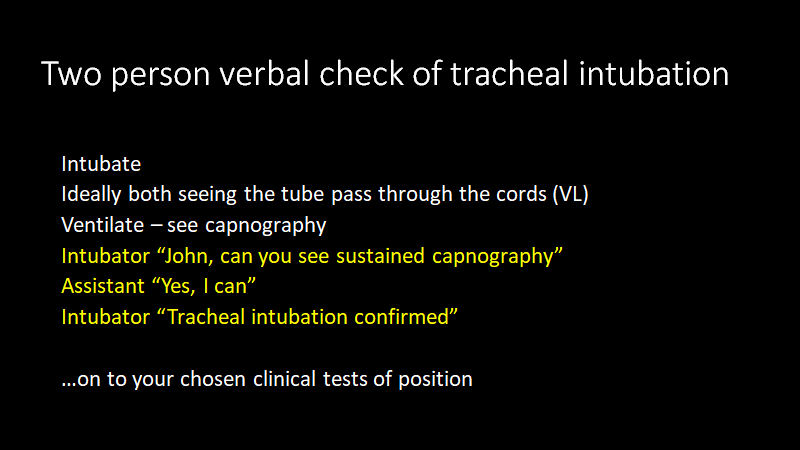 To trap undetected oesophageal intubation who is or is not up for a two person verbal check of capnography?