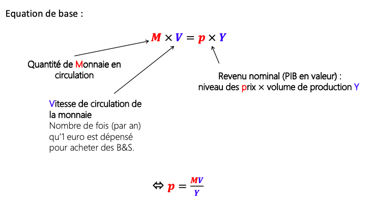 12/ Ainsi, en considérant V et Y constants, on s’aperçoit que l’augmentation de la masse monétaire M entraîne une hausse des prix = inflation.