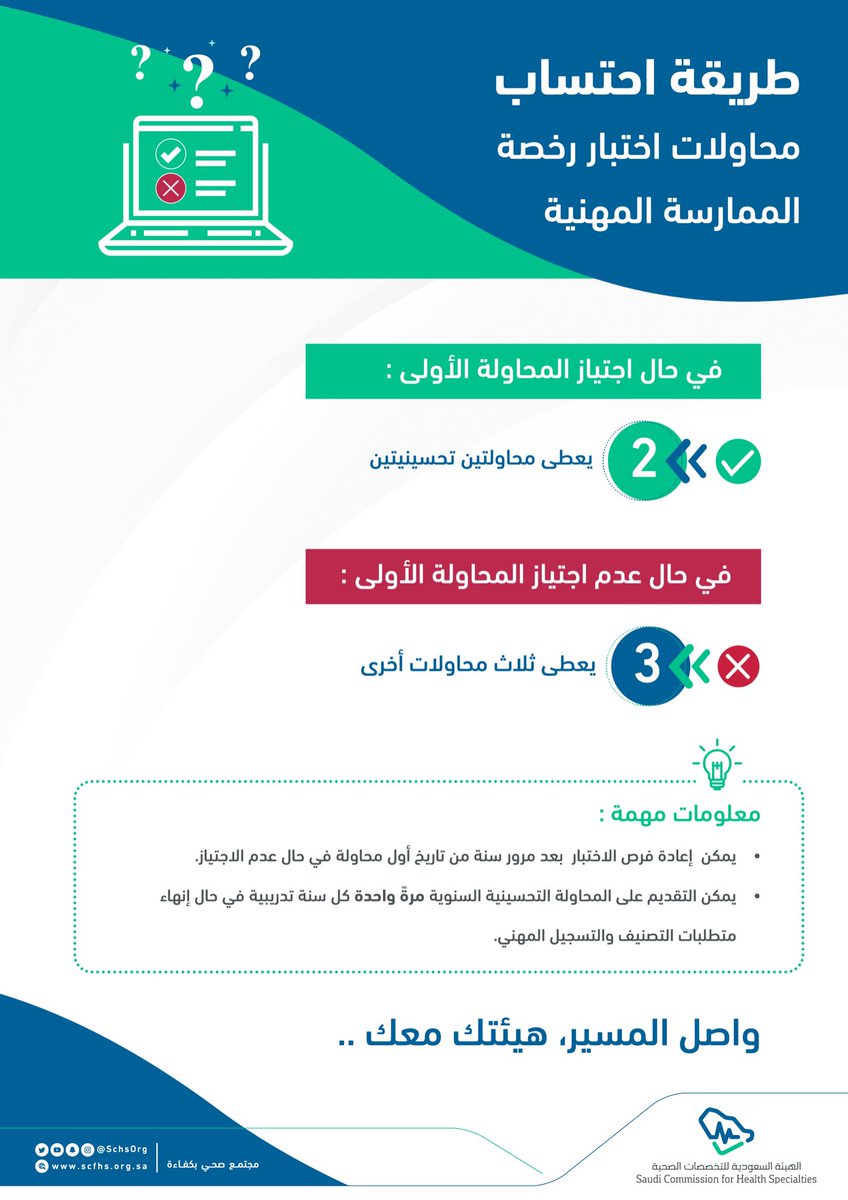 🔴 أعلنت هيئة التخصصات الصحية عن الطريقة الجديدة لإحتساب محاولات اختبار رخصة الممارسة المهنية 📝 وهي كالتالي:
