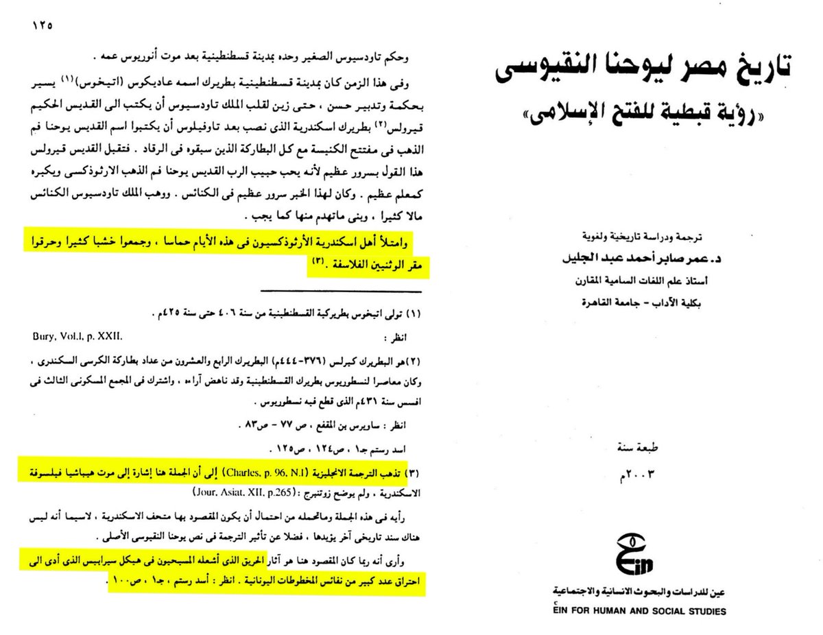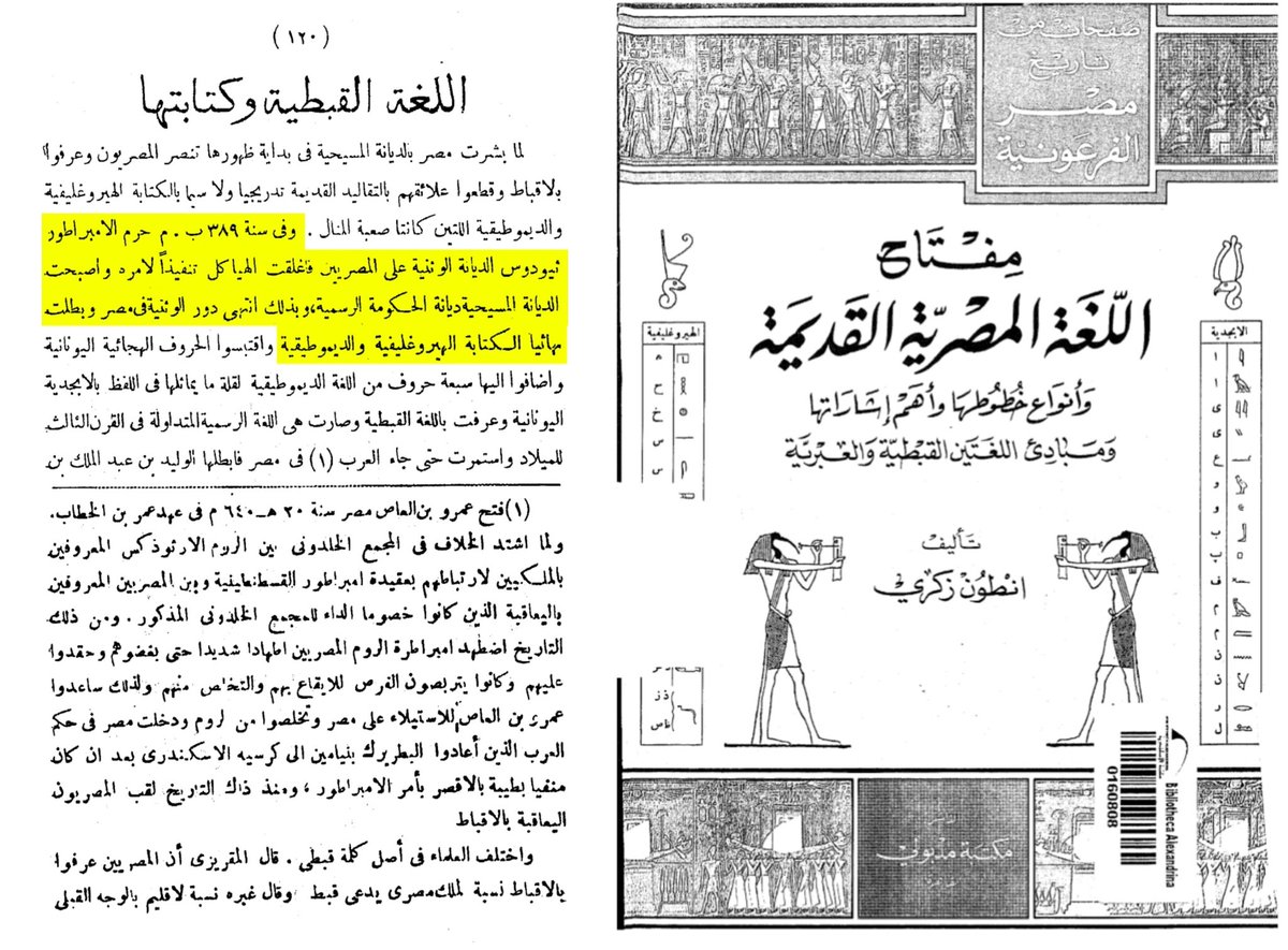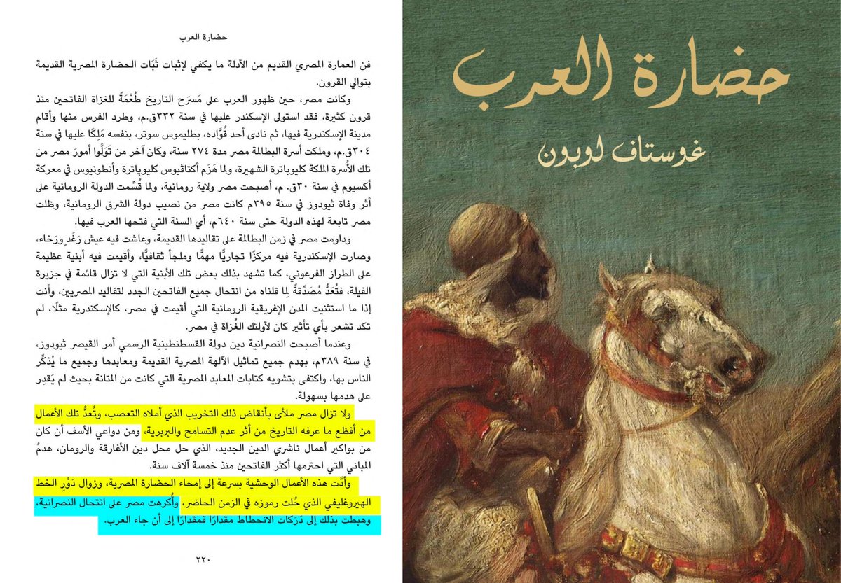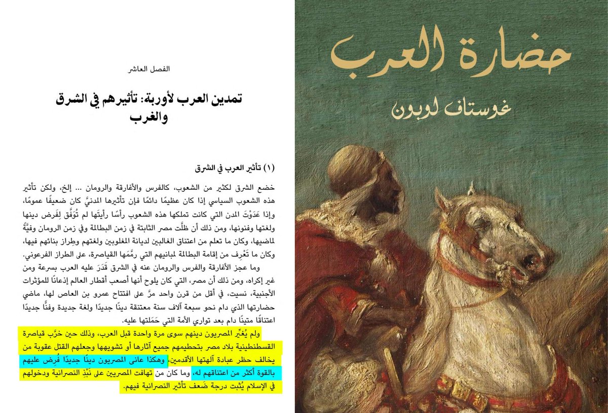 "ولم يغير المصريون دينهم سوى مرة واحدة قبل العرب وذلك حين خرب قياصرة القسطنطينية بلاد مصر بتحطيمهم جميع آثارها وجعلهم القتل عقوبة على من يخالف حظر عبادة آلهتها الأقدمين,وهكذا عانى المصريون ديناً فُرض عليهم #بالقوة.