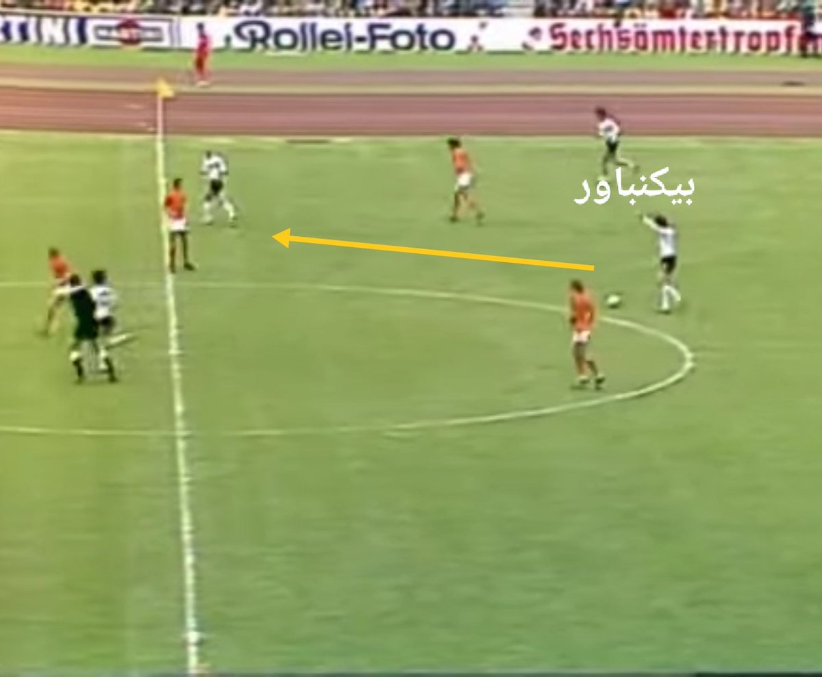 كانت موهبة بيكنباور الخاصة في هذا الصدد عاملاً رئيسياً في نهائي كأس العالم 1974. حاول الهولنديون وفشلوا في الضغط عليه بشكل فعال وتخلوا في النهاية عن محاولاتهم اليائسة لعرقلة نفوذه. سواء كان ذلك قصيرًا أو طويلًا، فقد لعب بيكنباور التمريرة اليمنى مرارًا وتكرارًا تحت الضغط ..