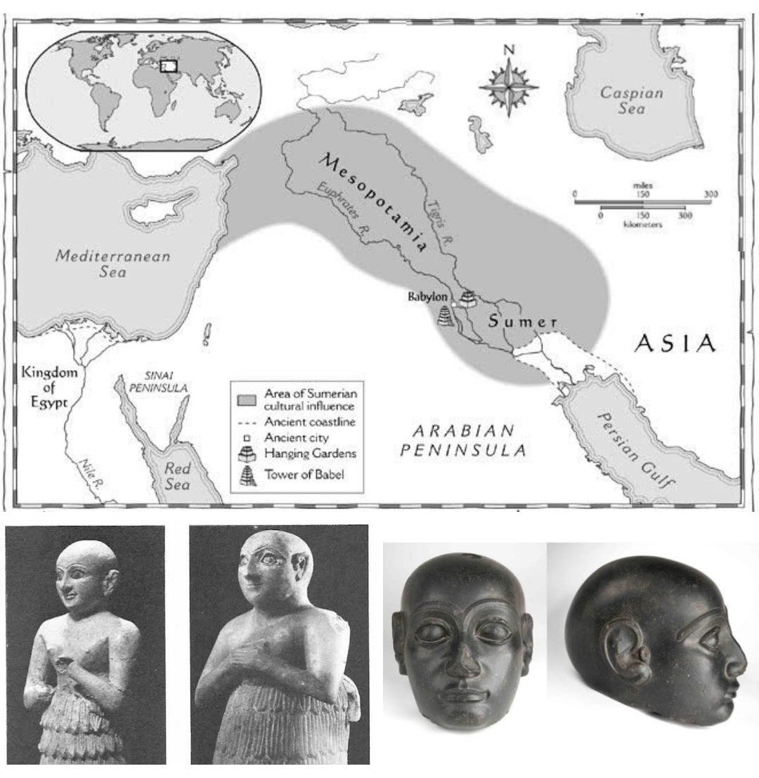 ☆ الدراسات ومصادر النقاط السابقة بالاسفل ياجماعة الخير، (وبالصور خريطة أقصي حدود إمتداد الثقافة السومرية وبعض التماثيل المعبرة عن أشكال السومربين) :