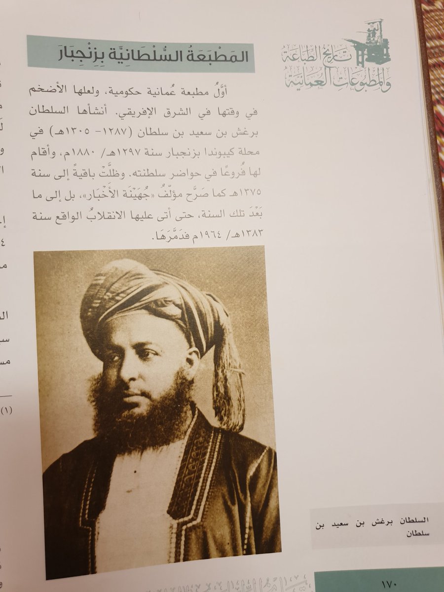 هذه المطبعة الأخيرة يسرد الباحث قصة إنشائها، وهي أنها "كانت إحدى ثمرات سياحة سلطان زنجبار برغش بن سعيد بن سلطان في أوروبا ومصر سنة 1877م، فإنه رأى ما عليه المطابع في بلاد مصر والشام فعزم على إدخالها في بلاده"،