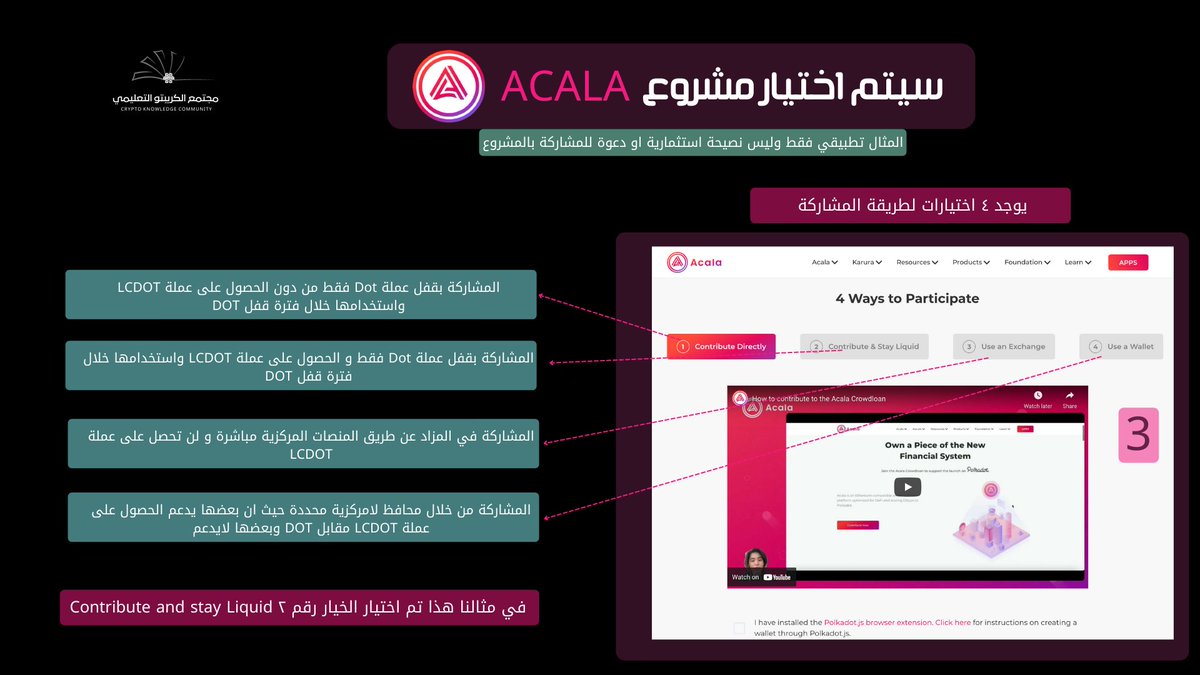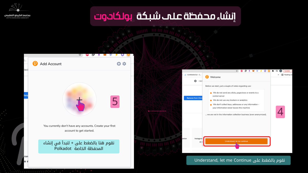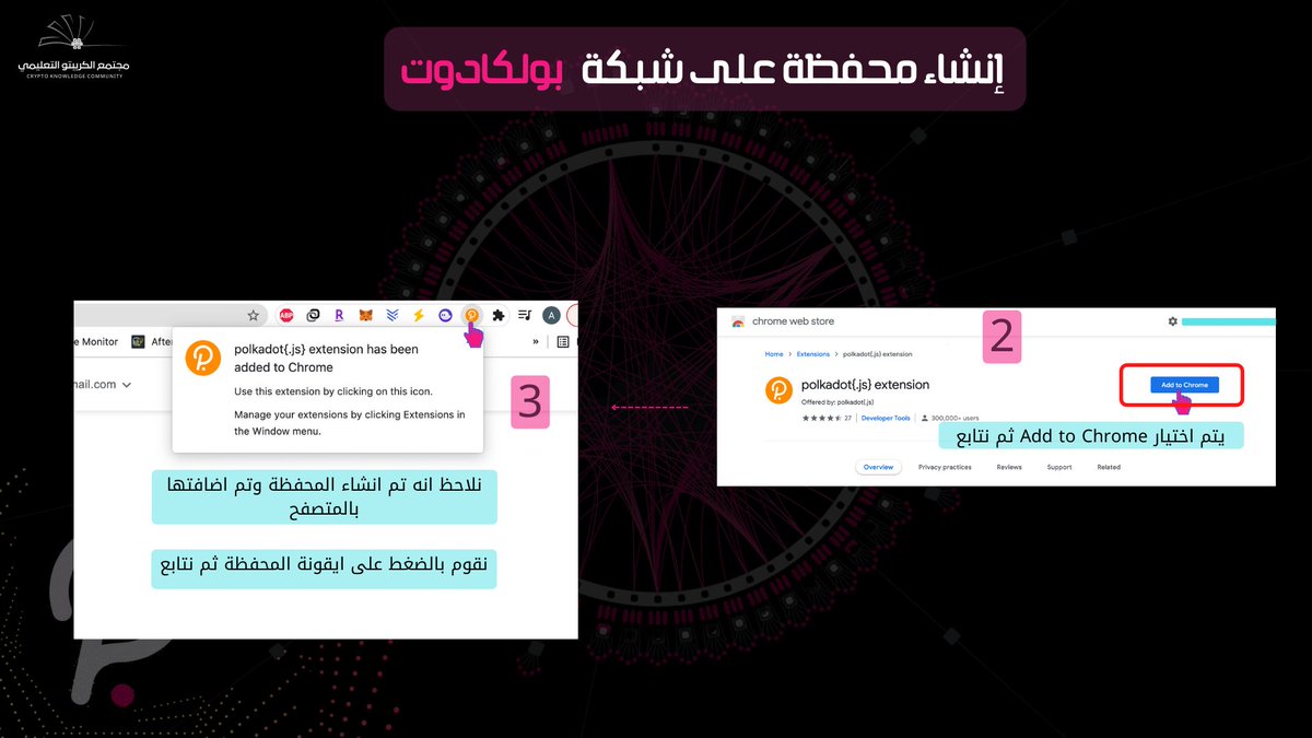 بعد ماتم إنشاء المحفظة بنجاح ، نتوجه الى موقع بولكادوت polkadot.js.org ثم نطبق الموضح بالصورة