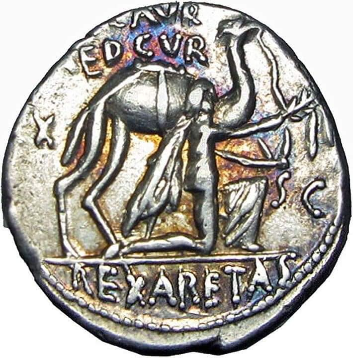 سكت هذه القطعة الرومانية التي تظهر الملك الحارث الثالث بجانب جمل تخليداً للمعاهدة التي بموجبها فك الحصار عن مدينة البتراء ورحيل الجيوش الرومانية عن مملكة الانباط وكتب تحت الحارث