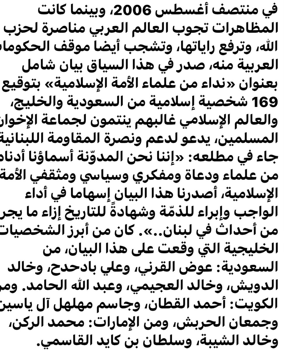 إننا قد نختلف مع حزب الله أو مع غيره، ولكن خلافنا معه لا يسوغ لنا ألا نقف معه في دفاعه عن الأمة ودفع الظلم والعدوان عن الشعب اللبناني كله وليس عن الحزب فقط، ولو كان الظلم والعدوان الذي يقع على الشعب اللبناني يقع على هندوسي أو بوذي لوجب علينا أن ندفعه عنهم ولا نرضاه