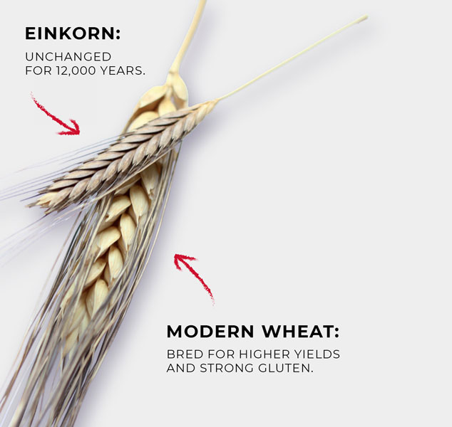"بسبب عمليات التهجين الحديثة والمتكرر التي يديرها الإنسان والتلاعب الجيني؛ فإن أنواع Triticum المتوفرة اليوم هي بعيدة كل البعد بمقدار آلاف الجينات عن أصنافه المتوفرة العصور القديمة."