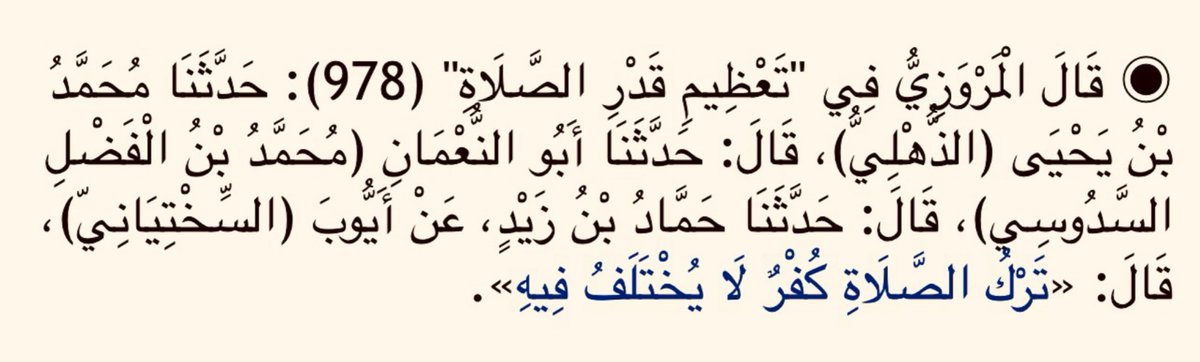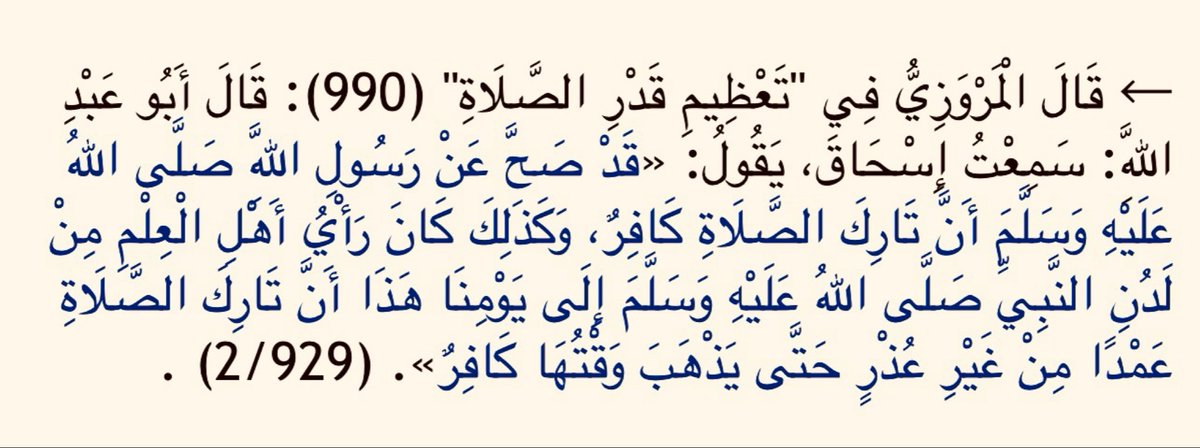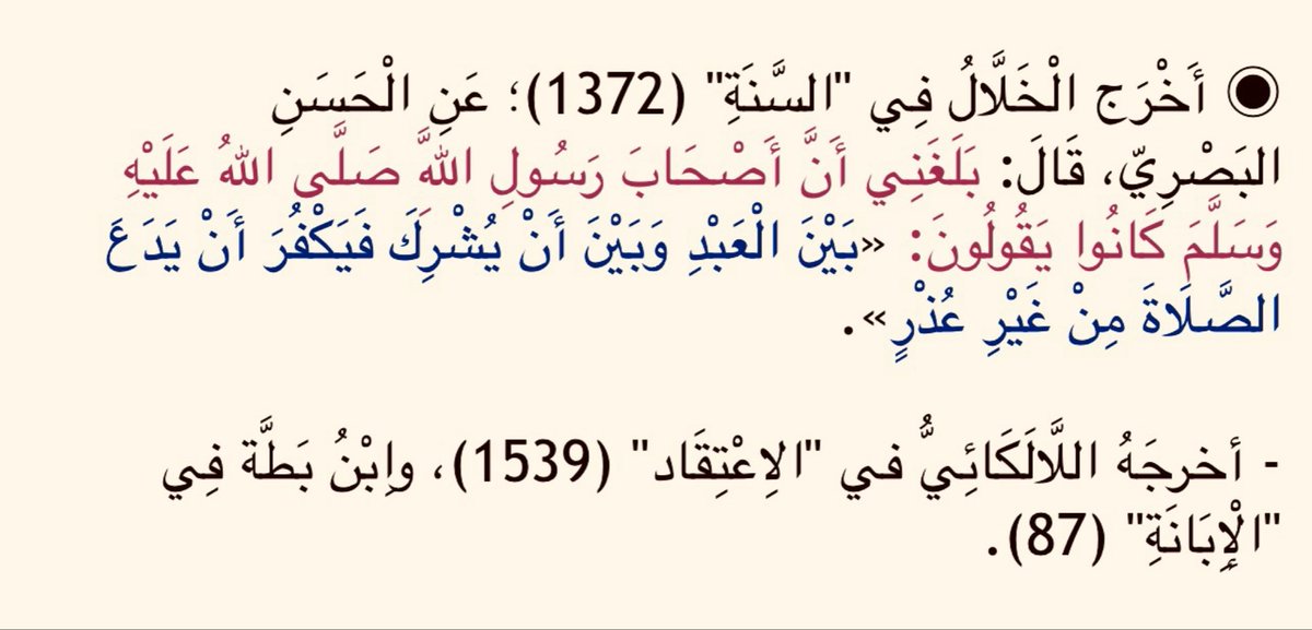 «كان أصحابُ مُحمَّدٍ صلَّى اللَّهُ عليهِ وسلَّمَ لا يَرَونَ شيئًا من الأعمال تَركُهُ كُفرٌ غير الصَّلاةِ».