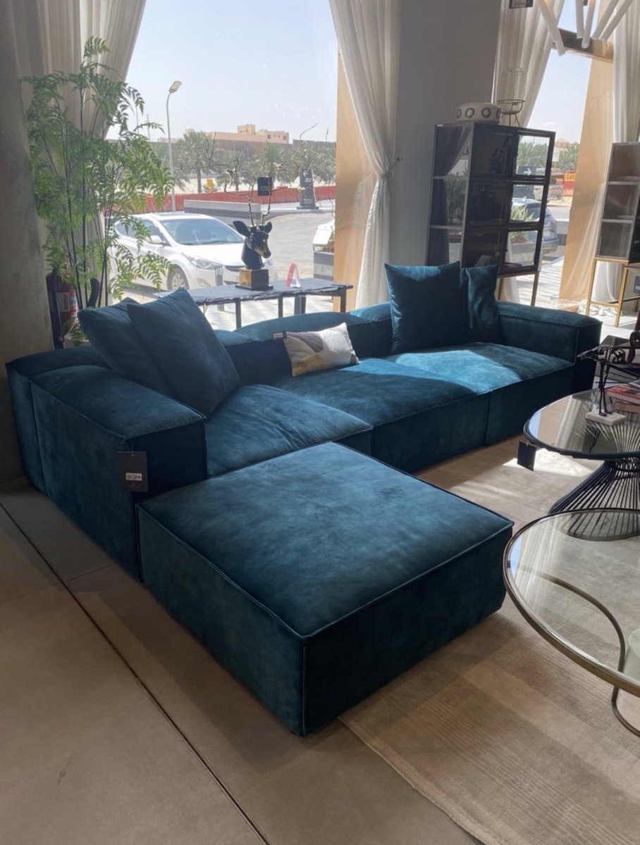 التأثيث | أجمل مراحل المشروع اعتمد على أن تكون أسطح الطاولات باللون الأبيض أو الاسود تكاملاً مع #التصميم_الداخلي وبالنسبة للجلسات اعتمدت اللون البترولي كونه لون عملي ورسمي لمنطقة المعيشة والطعام مع كسره باللون الحيادي وذلك لإبراز القطع والاكسسوارت ذات اللون الذهبي ✨
