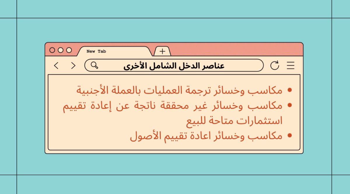عناصر الدخل الشامل الأخرى تظهر عندنا في قائمة الدخل الشامل وقائمة التغير في حقوق الملكية👍🏻