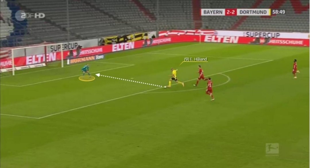 - نوير: "ليس كثيرًا. كان من الممكن أن تسير الأمور بنفس الشكل على الجهة الأخرى مع رويس لكن هناك عوامل أخرى تضعها في حساباتك، على سبيل المثال نوعية التسديدات التي يستخدمها المهاجم لإنهاء الهجمات."