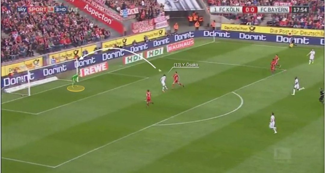 نوير: "بطبيعة الحال، الأفضل دائمًا بالنسبة لي هو أن أتمكن من الوصول للكرة أولًا لكن هذا غير ممكن [في هذا الموقف]. كقاعدة، كلما اقتربت أكثر كان ذلك أفضل لكنني قد أقع في ورطة أيضًا إن اقتربت وكنت بزاوية قائمة أكثر من اللازم وقدماي ثابتتان، حينها سيمر المهاجم بالكرة وتتعقد الأمور."