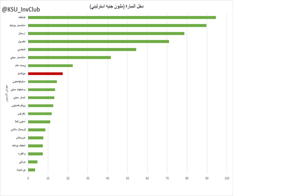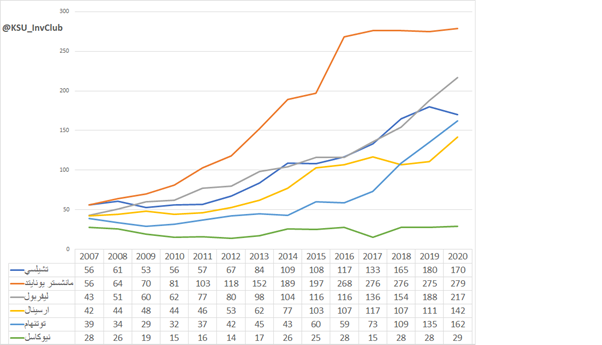 (يجب الاخذ بعين الاعتبار انه تم ضخ مبالغ كبيره قبل تطبيق قانون اللعب المالي النظيف، والذي صدر في عام 2011 والذي ينص على منع الأندية من الانفاق اكثر مما تكسبه، لكنه لا يشمل البنيه التحتية)