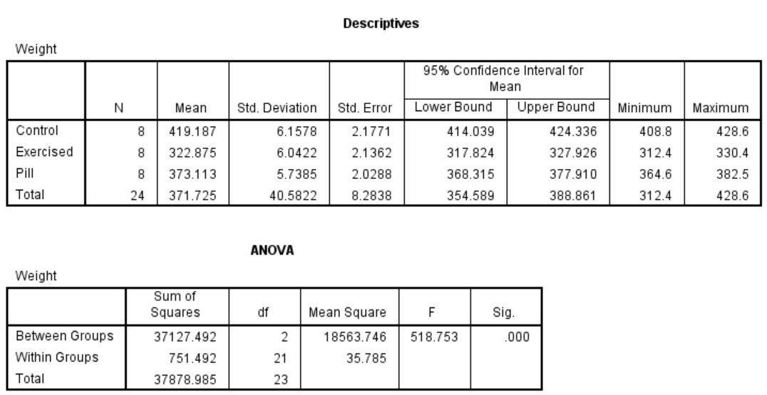 F= 518.7 (2,21), p-value <0.001. Exercise group was lowest in weight versus the pills and the control groups ( 322 versus 373 and 419) respectively.