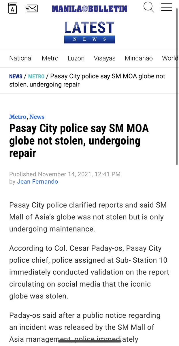 الشرطة الفلبينية قطعت كل الشائعات ونشرت بيان تقول فيه أن الكرة المعدنية الضخمة التي تمثّل الكُرة الأرضية لم تُسرق، بل موجودها مكانها وقامت إدارة المجمع التجاري بتغطيتها لغرض الصيانة فقط.