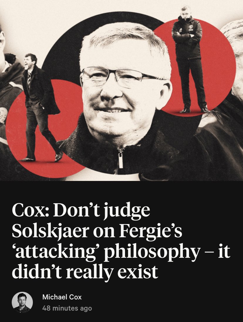 " فقط قلةٌ من خارج محيط مانشستر يونايتد يعتقدون أن فريق يونايتد كان مبنيًا على الشق الهجومي بصورةٍ أُحادية، ولكن لا يستطيع أحدٌ أن يؤشر على هذه الصورة في فترةِ سولشاير الحالية، ولا من أي من تلاميذ فيرغسون إهتموا بها حينما أصبحوا مدربين."