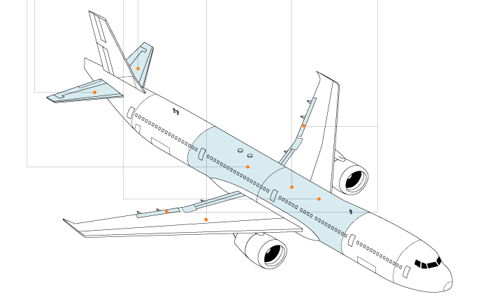 وايضاً صناعة جزء كبير من مكونات جسم طرازات عديدة من طائرات ايرباص واكتفي بتوضيح طائرة ايرباص طراز ٣٨٠ Airbus A380 تجدونها مضللة باللون الكريستالي ومشار إليها بالنقط الصفراء كما في الصورة المرفقة أدناه