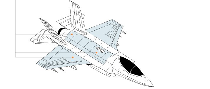 كما اصبحت تستطيع صناعة جزء من مكونات جسم وهيكل طائرة اف ٣٥ F-35 تجدونها مضللة باللون الكريستالي ومشار إليها بالنقط الصفراء كما في الصورة المرفقة أدناه