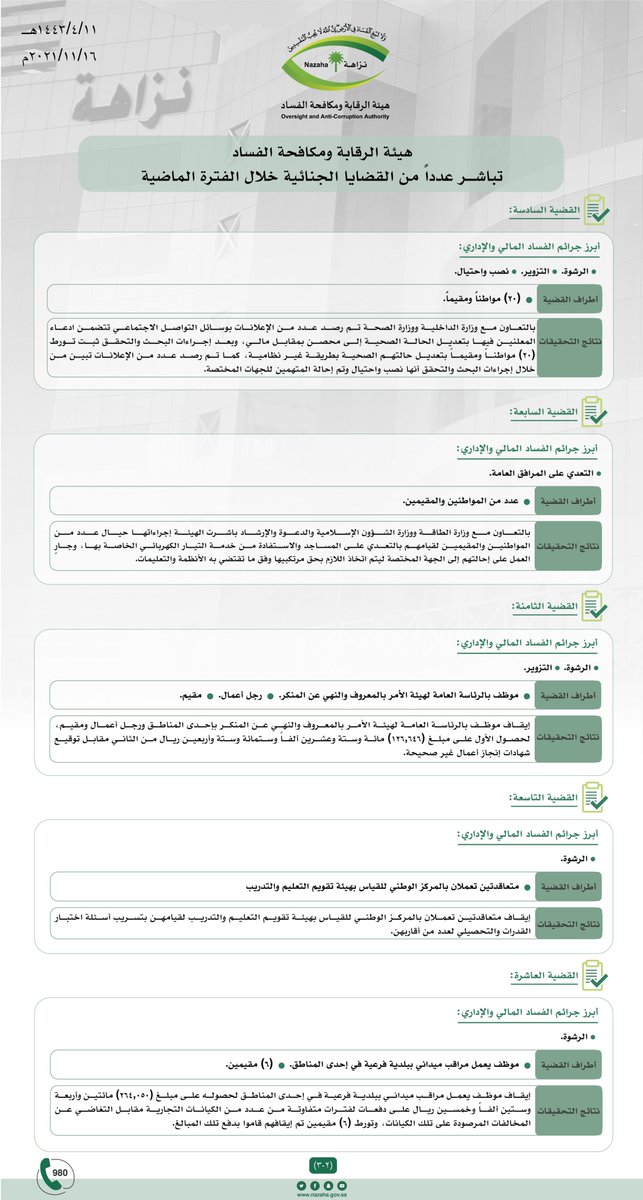 القضية 10: إيقاف موظف يعمل مراقب ميداني ببلدية فرعية في إحدى المناطق لحصوله على مبلغ 264,050 ريال على دفعات لفترات متفاوتة من عدد من الكيانات التجارية مقابل التغاضي عن المخالفات المرصودة على تلك الكيانات، وتورط 6 مقيمين تم إيقافهم قاموا بدفع تلك المبالغ.