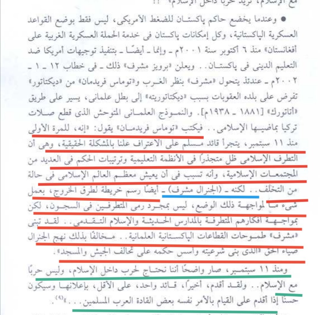 ويكتب توماس فريدمان قائلا:(أنه ومنذ هجمات 11 سبتمبر يتجرأ قائد مسلم(يعني حاكم باكستان مشرف) ويعترف