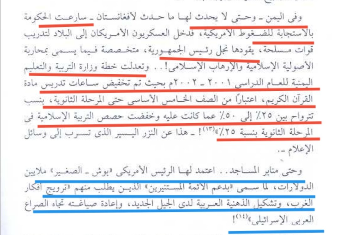 في اليمن سارعت الحكومة بالاستجابةللمطالب الغربية ودخلوا بحجة محاربة الإر8اب وعدلوا مناهج وزارة التربية والتعليم هناك ودعموا الفكر التنويري في مواجهة الفكر الإسلامي وأعدوا عملاء جدد و و