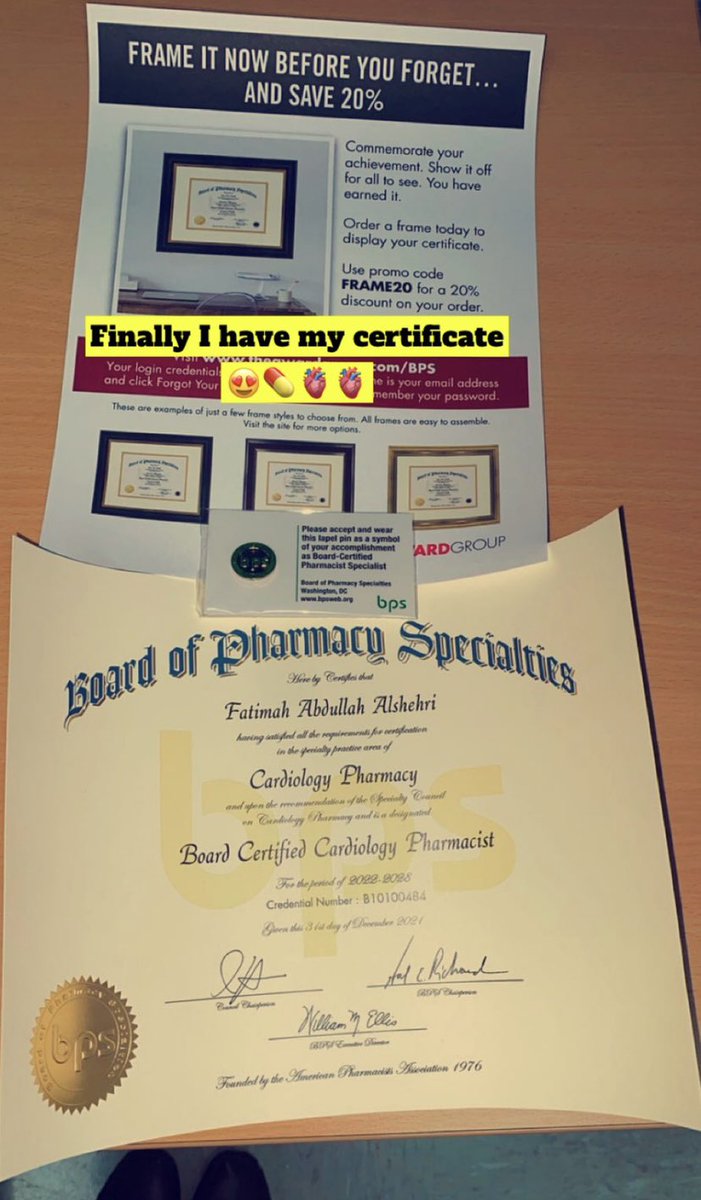 علاجيات💊امراض القلب🫀عشقي❤️من زمان واخيراًعديت في بورد#علاجيات_القلب(BCCP) اللي تأجل بسبب كورونا كثير😫المهم ماعاد اخاف من اسئلة الكارديو والان(I’m a Board Certified Cardiology Pharmacist BCCP)،ويقول عنترة: