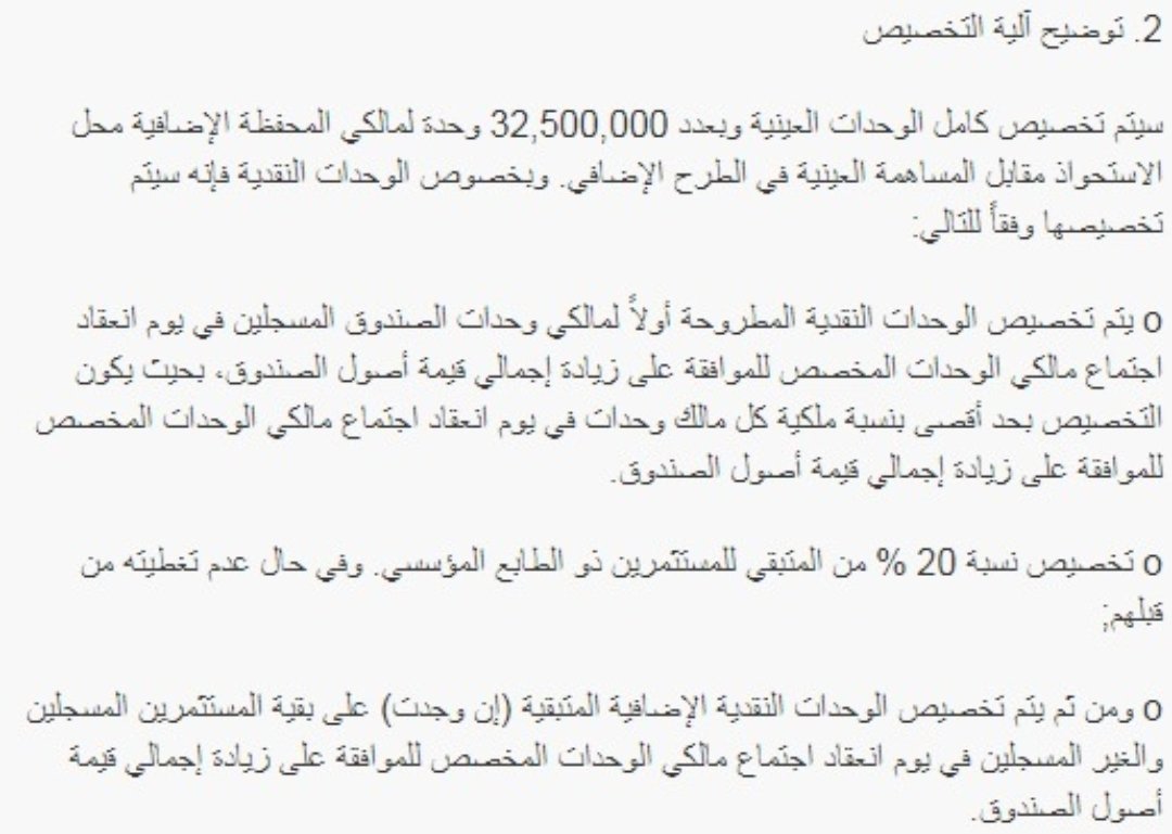 سيولد ذلك ضغوط بيعية بعد موعد الجمعية و الموافقة على الطرح الإضافي في حال كان سعر الوحدة مرتفع لأنه من المنطق أن يبيع بعض الملاك ما يكفي للاكتتاب في الوحدات المضمونة بسعر أقل