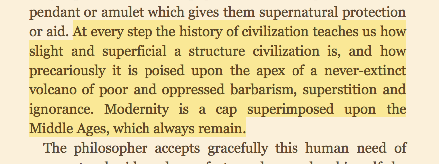“For barbarism is always around civilization, amid it and beneath it, ready to engulf it by arms, or mass migration, or unchecked fertility. Barbarism is like the jungle; it never admits its defeat; it waits patiently for centuries to recover the territory it has lost.”