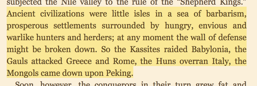 “It is almost a law of history that the same wealth that generates a civilization announces its decay. For wealth produces ease as well as art; it softens a people to the ways of luxury and peace, and invites invasion from stronger arms and hungrier mouths.”