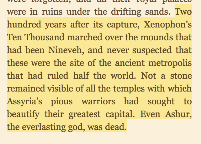 “His death was in any case a symbol and an omen; soon Assyria too was to die, and from causes of which Ashurbanipal had been a part.”