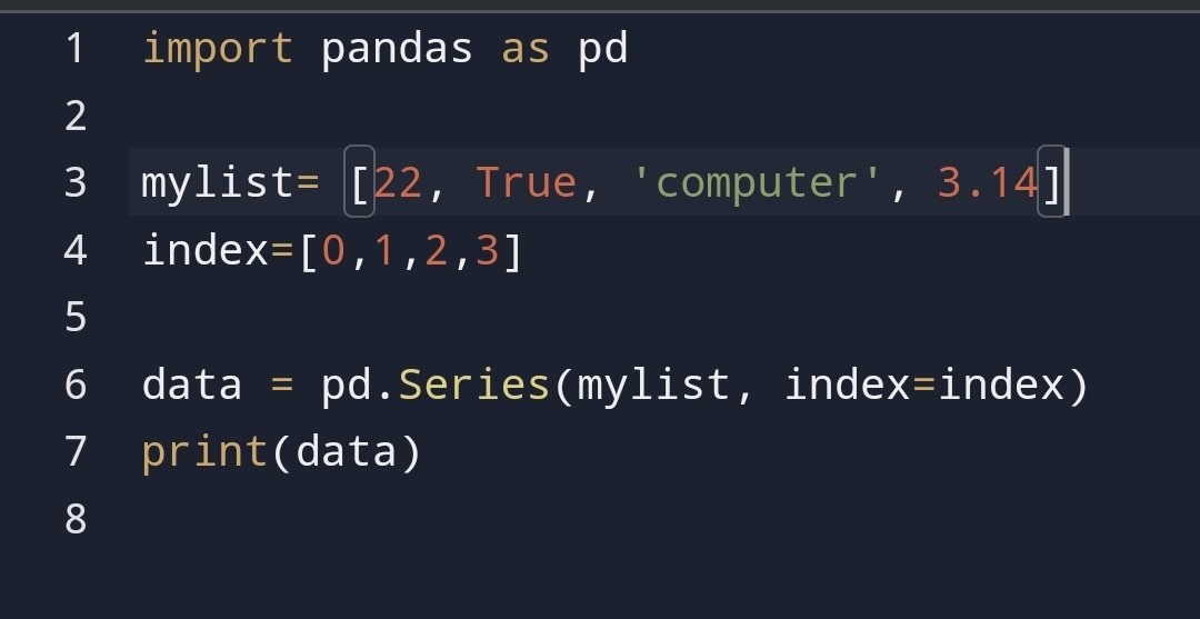 الـ Series: تقدر تقول أو تعرف الـ Series إنها عبارة عن list ولكن ليها index، الseries هي مصفوفة ذات بعد واحد، عبارة عن column واحد فقط بيحتوي على أي نوع من أنواع البيانات (integer, String, float او اي نوع عامة)