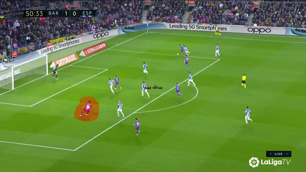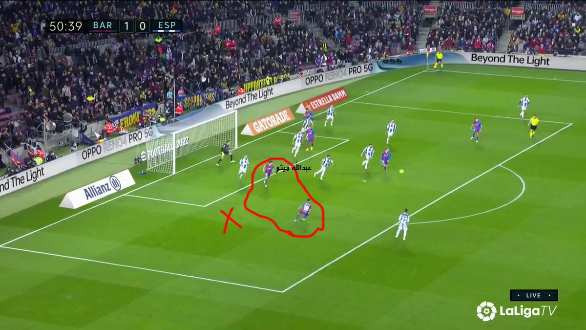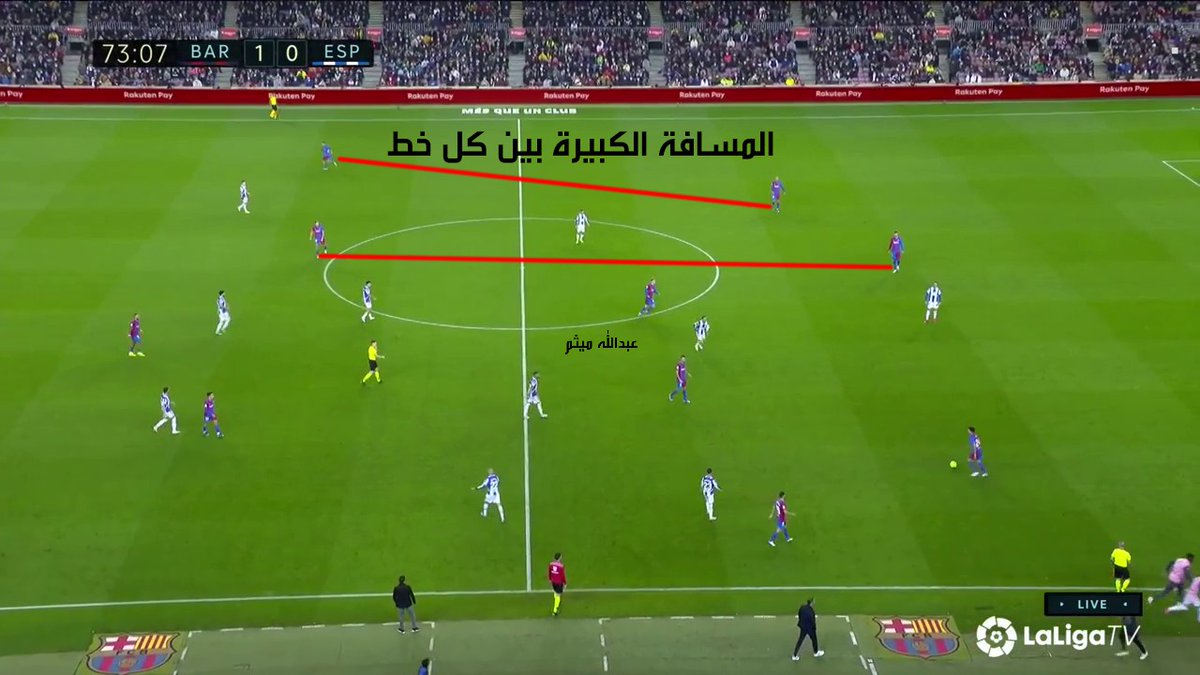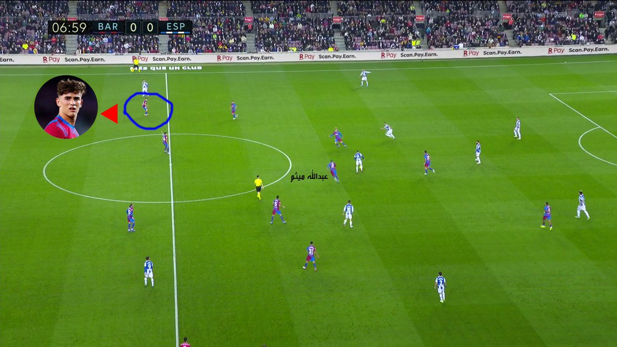 و هو ان غافي هو من يوسع الملعب وهذا امر خاطئ بسبب نجاح التكتيك الثاني الذي كان حلا لمشكلة خماسي دفاع اسبانيول ( لو كان متواجد في هذه الحالة كان ممكن هدف ثاني في فرصة الزلزولي )