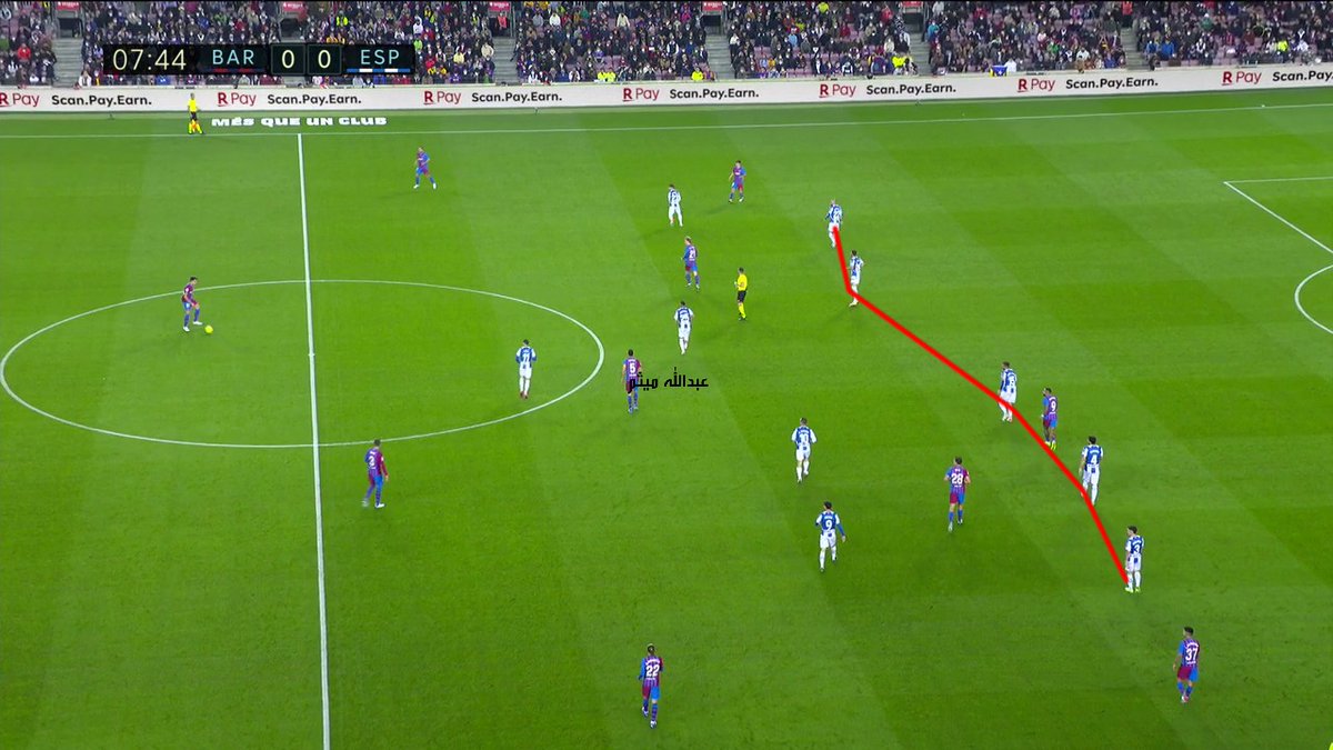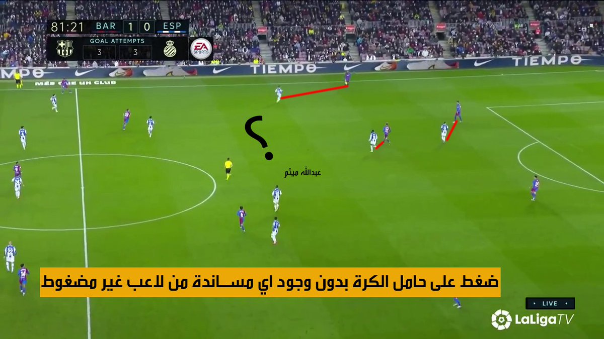 7- المهمة كانت ستكون اسهل لو كان الخصم يلعب ب 4 مدافعين فقط ولكن اسبانيول قرأ المباراة بشكل صحيح و اعاد لاعب من خط الوسط للدفاع لسد اغلب المساحات في الخط الخلفي و ترك الاستحواذ لبرشلونة و الاعتماد على المرتدات.