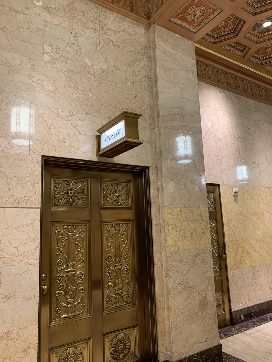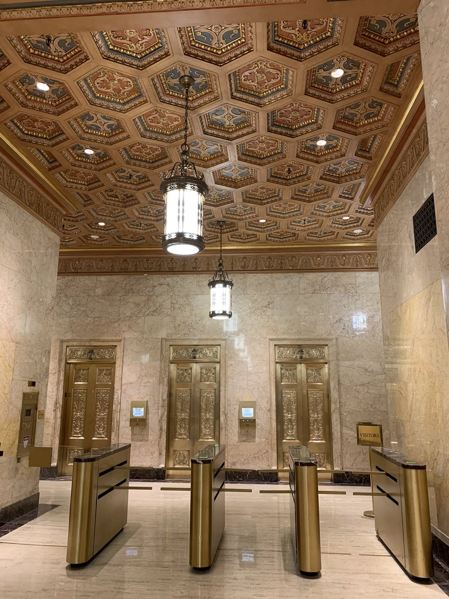 كان لدي موعد اسنان في عيادة بمنهاتن، واثناء دخولي الى لوبي العمارة التي توجد بها العيادة، اذهلني روعة جمال اللوبي، فهو لايزال محتفظ بتاريخه وزخارف سقفه ونقش بيبانه، احسست بالمكان وكأني اعيش لحظة افتتاحة سنة ١٩٥٢م، بادرني موظف الاستقبال اي طابق تريد ان تصعد له1️⃣