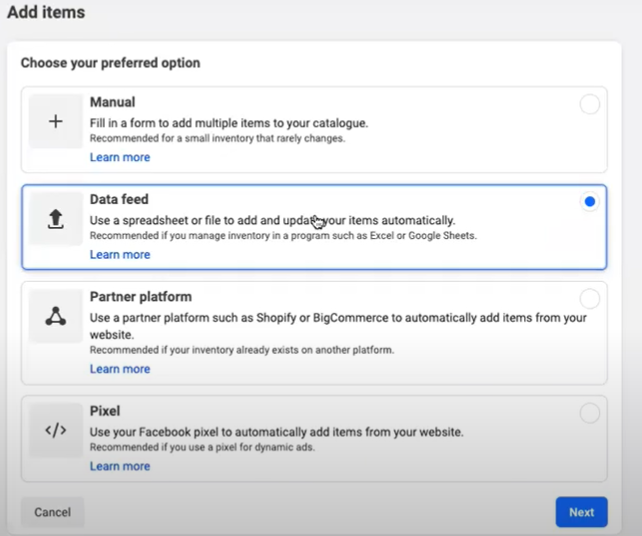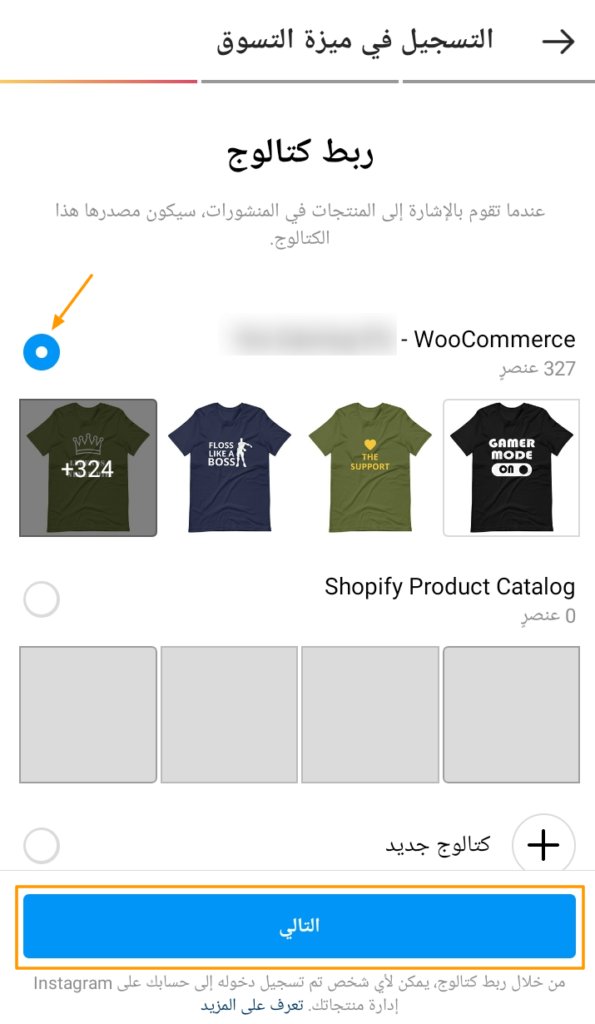 اختر كتالوج المنتجات الذي تريد إضافته من موقعك الأصلي على الإنترنت إلى متجر انستقرام ثم اضغط على (Product Catalogue) ثم (Done).