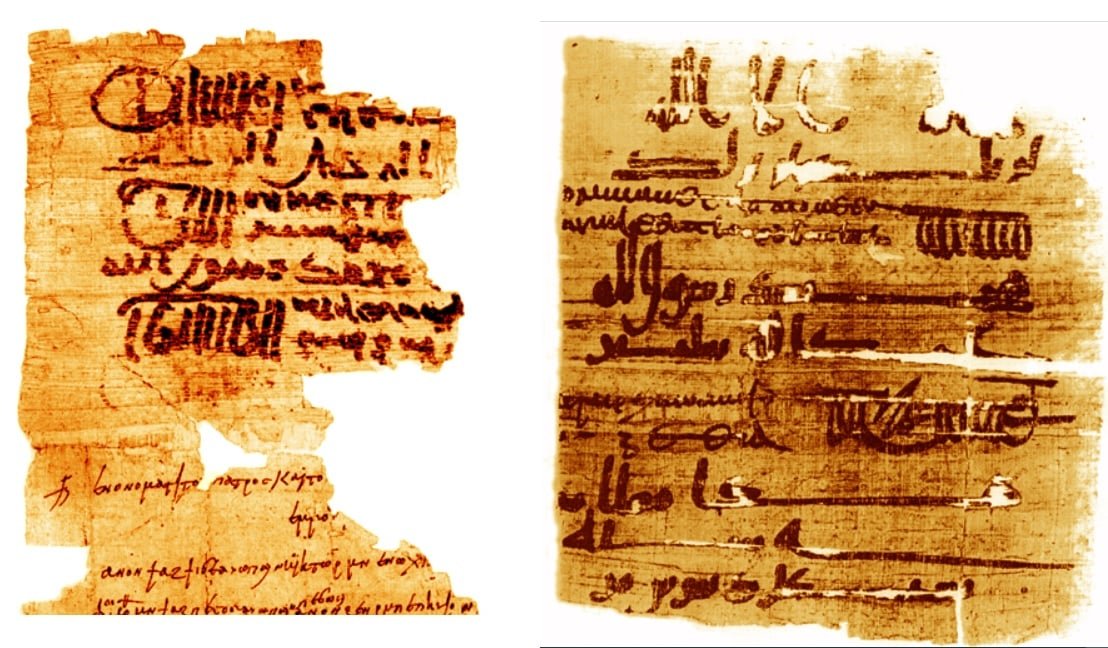 الصورة: طوماران مروسان بالرموز صعبة التزوير، وباللغتين العربية واليونانية، صادران عن الوليد بن عبد الملك، وسليمان بن عبد الملك.