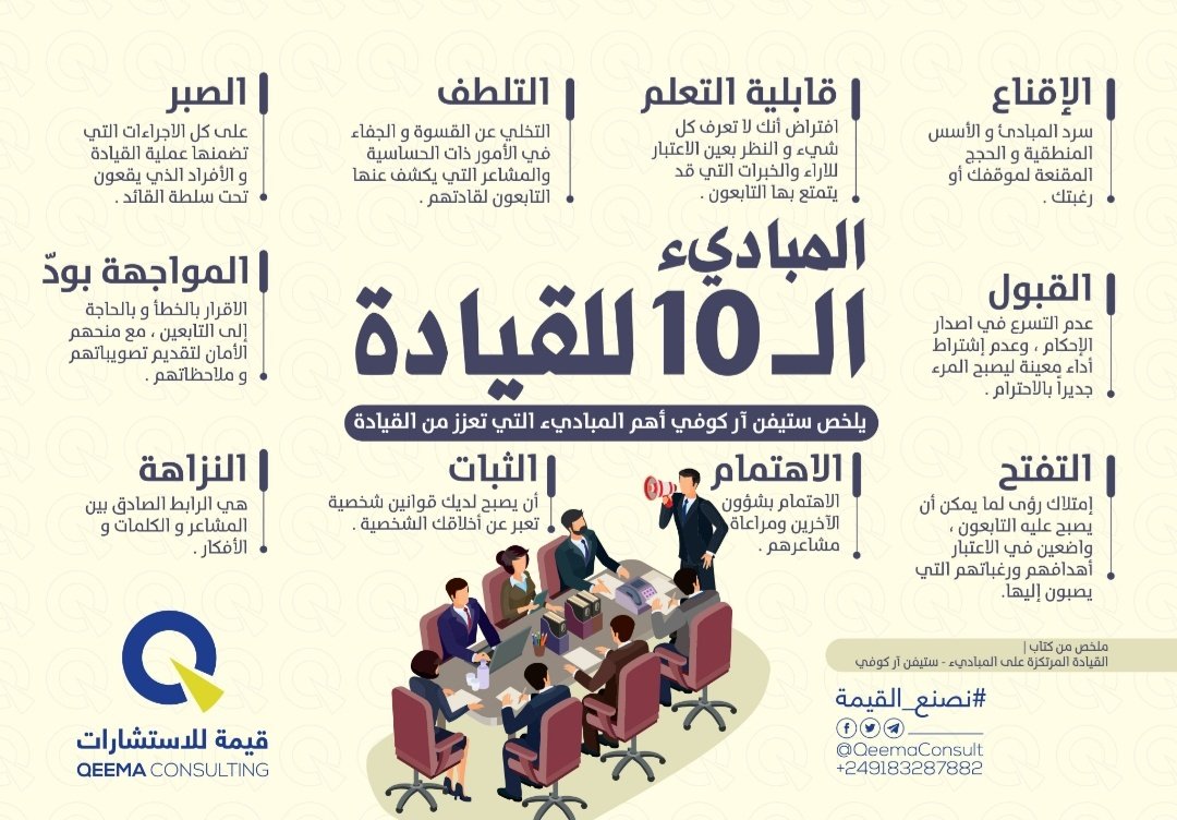 وفي ال📸 انفوجراف يوضح المبادئ العشرة للقيادة التي طرحها د.ستيفن كوفي في كتابه القيادة المرتكزة على مبادئ.