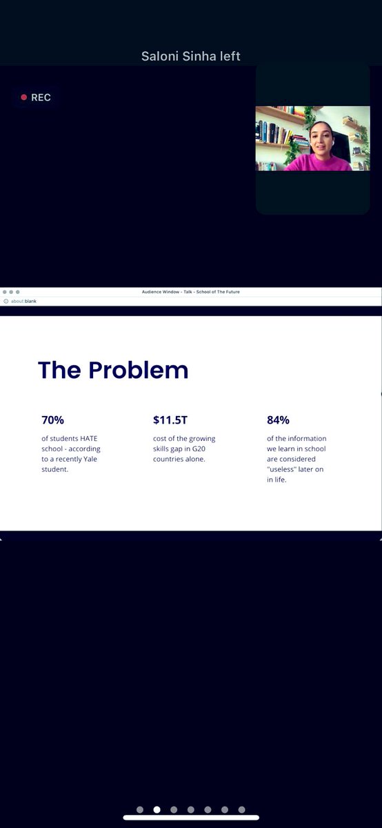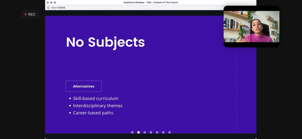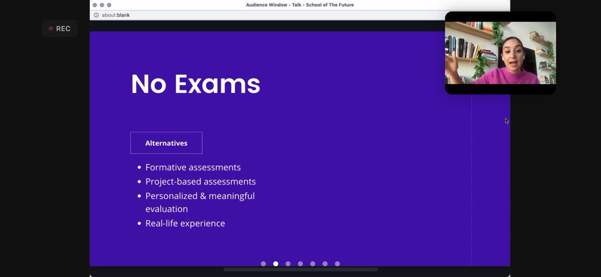 اقترحت المتحدثة نظم تعليمية محدّثة كلياً (disruptive education) بحيث تكون عملية التعليم لا تعتمد على المحاضرات التقليدية ولا على المناهج ولا تعد الاختبارات آلية لتقييم الطلاب..