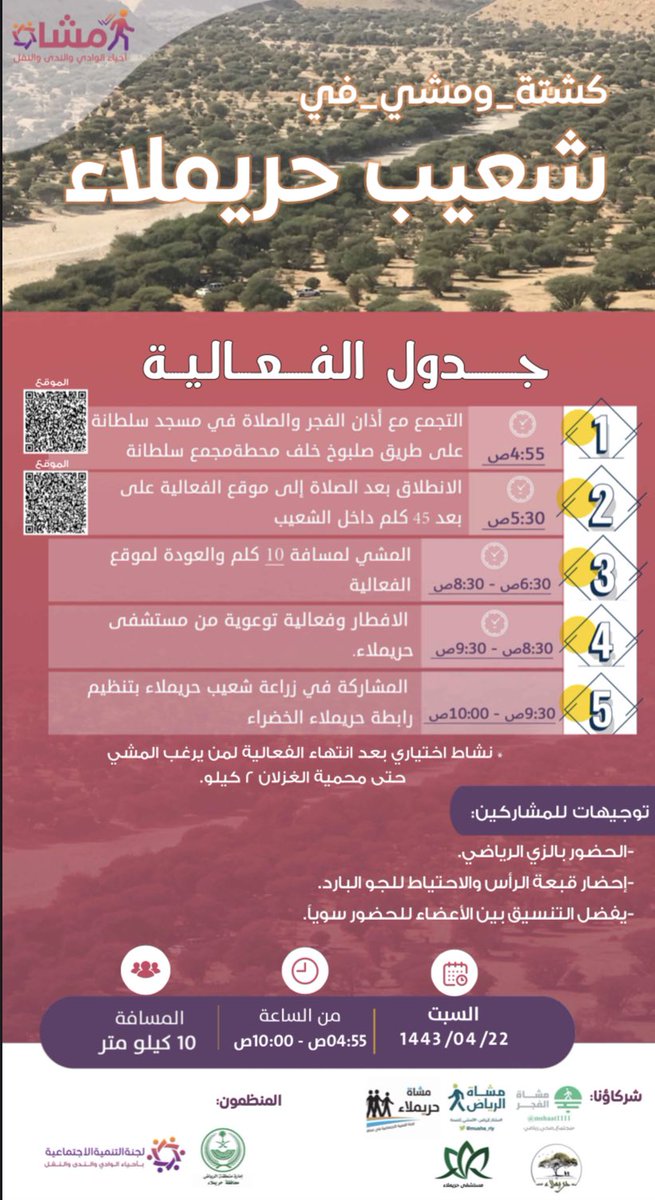 نهدف من فعالية #كشته_ومشي الى توعية المجتمع لتغيير النمط المعتاد للرحلات البرية المخصصة للأكل والشرب والجلوس لتكون نشطه بإدخال #المشي_للصحة فيها والاستمتاع ب #المشي_في_الطبيعة