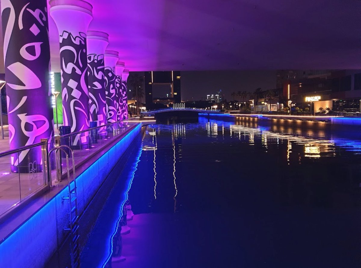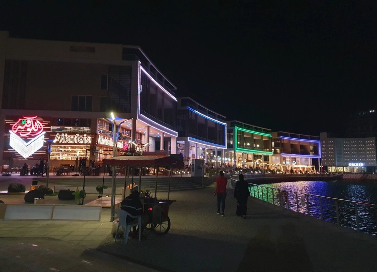 للجلسات الخارجية بالليل اذا انتم قريبين منها ، منطقة مدينة الحديقة المائية وفيها اطلالة مائية وعدة مطاعم وكافياهات وميزتها بجنب فندق جراند سويس.