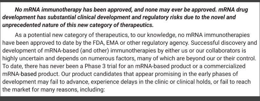 هذا من ملف BioNTech لدى هيئة الأوراق المالية والبورصات الأمريكية. تم تقديمه في 31 ديسمبر 2019. لاحظ كيف يتم وصف منتج mRNA كعلاج مناعي. ينص بوضوح على أن منتج mRNA لم تتم الموافقة عليه من1️⃣